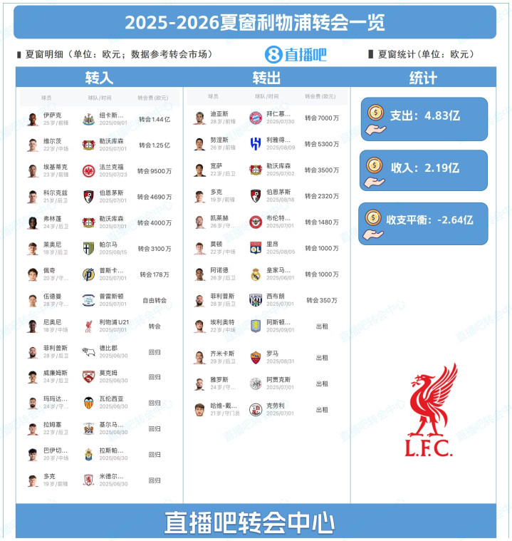 利物浦今夏花费4.83亿欧补强,引进了伊萨克、维尔茨、埃基蒂克等人,但英超才进行到第八轮,他们已经输了三场。上赛季整个赛季,利物浦只在英超输了4场。