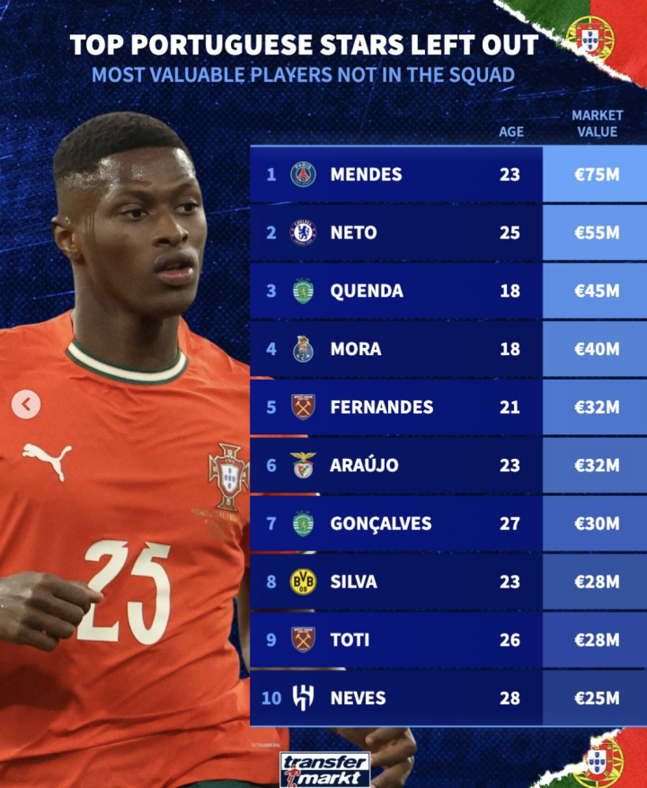 虎扑11月13日讯德转统计了落选最新一期葡萄牙队的球员身价榜。