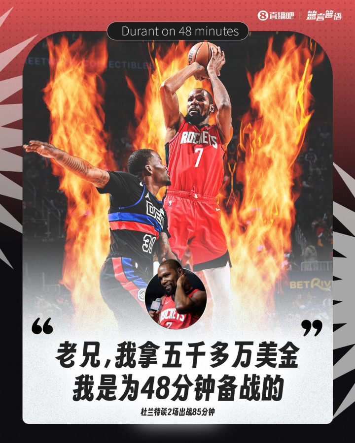 谈到此事时杜兰特表示:“我感觉很棒。那是我拿薪水该做的事,老兄。我拿五千多万美金,就得随时待命上场打球。你知道,在我的球队需要我时随时准备着。所以,我需要以正确的方式做好准备,这样我才能备战40分钟以上的出场时间,我是为每晚打48分钟做准备的,我没问题。”